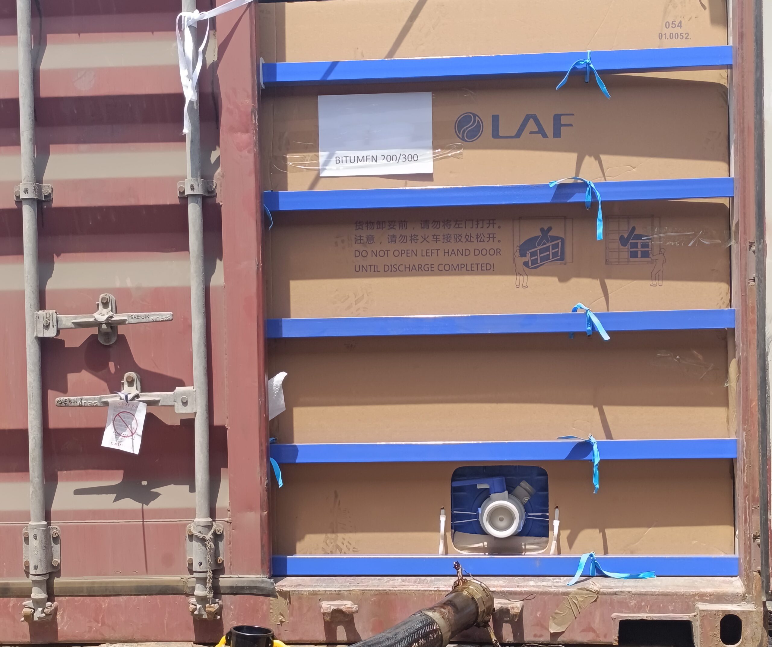 Molten bitumen (≤ 110°C) is pumped into the flexitank via a top or bottom valve system. The flexitank is then sealed. The container is left open briefly to allow the bitumen to cool and solidify naturally.